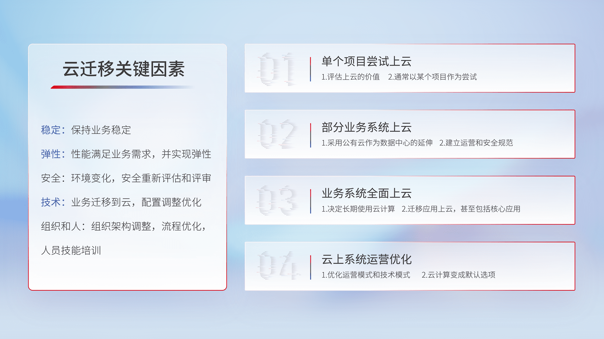 结合实际业务,,,,从规划设计、、、云平台选型、、云原生改造、、、数据迁移、、、集成交付,,迁移全过程为客户识别最佳上云路径,,做好风险识别管理,,设计网络架构、、、身份权限、、、安全审计合规、、操作审计、、、日志审计、、、监控告警策略、、、多站点容灾设计等,,,,对云上基础设施进行整体规划,,,,提升IT治理水平,,,,以满足弹性、、、、高可用、、高性能的需求。。。。