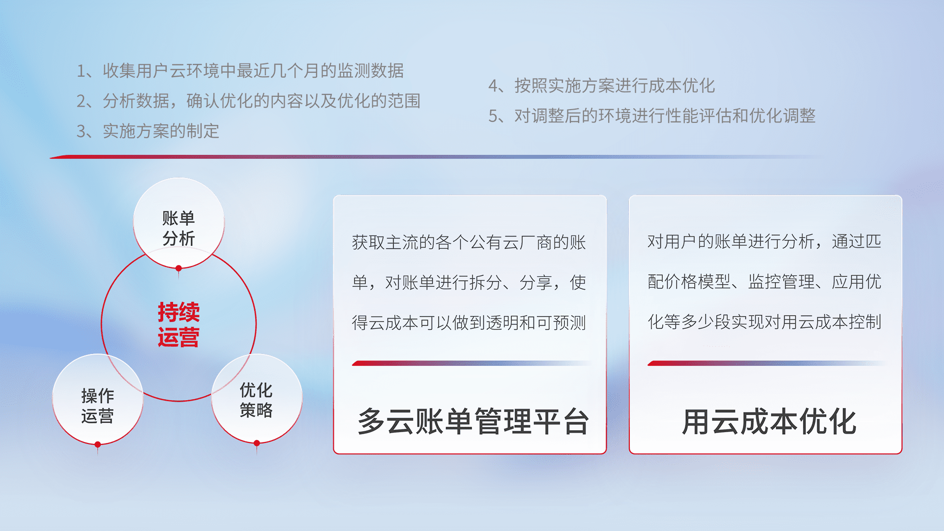 通过多云纳管,,以统一的资源数据模型把客户的云资源进行抽象和封装,,,进而实现对多云资源的统一操作,,保障云资源管理的可靠性、、稳定性与可用性。。量身定制化运维内容,,配置、、开发运维、、、补丁管理、、、备份、、、监控、、认证和访问管理、、、审计和日常巡检等,,,,保障在用云过程中的可靠度,,稳定度以及高可用率。。。。
